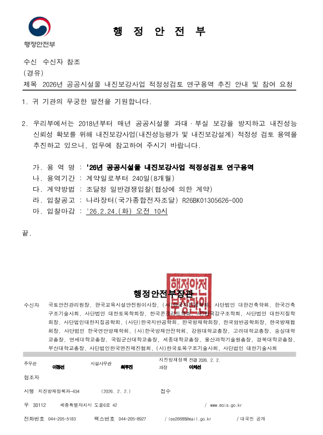 2. 우리부에서는 2018년부터 매년 공공시설물 과대·부실 보강을 방지하고 내진성능 신뢰성 확보를 위해 내진보강사업(내진성능평가 및 내진보강설계) 적정성 검토 용역을 추진하고 있으니, 업무에 참고하여 주시기 바랍니다.