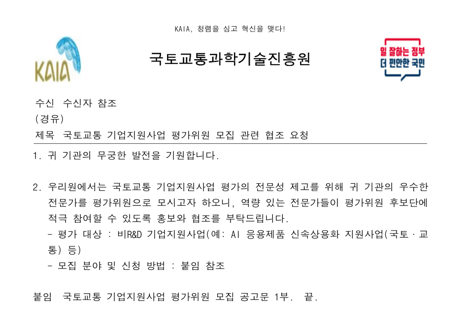 | [일반] [국토교통과학기술진흥원] 국토교통 기업지원사업 평가위원 모집 관련 협조 요청 |