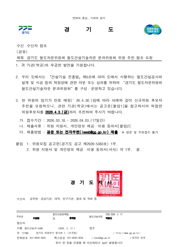 | [일반] [경기도] 철도자문위원회 철도건설기술자문 분과위원회 위원 추천 협조 요청(~4/1(수)) |